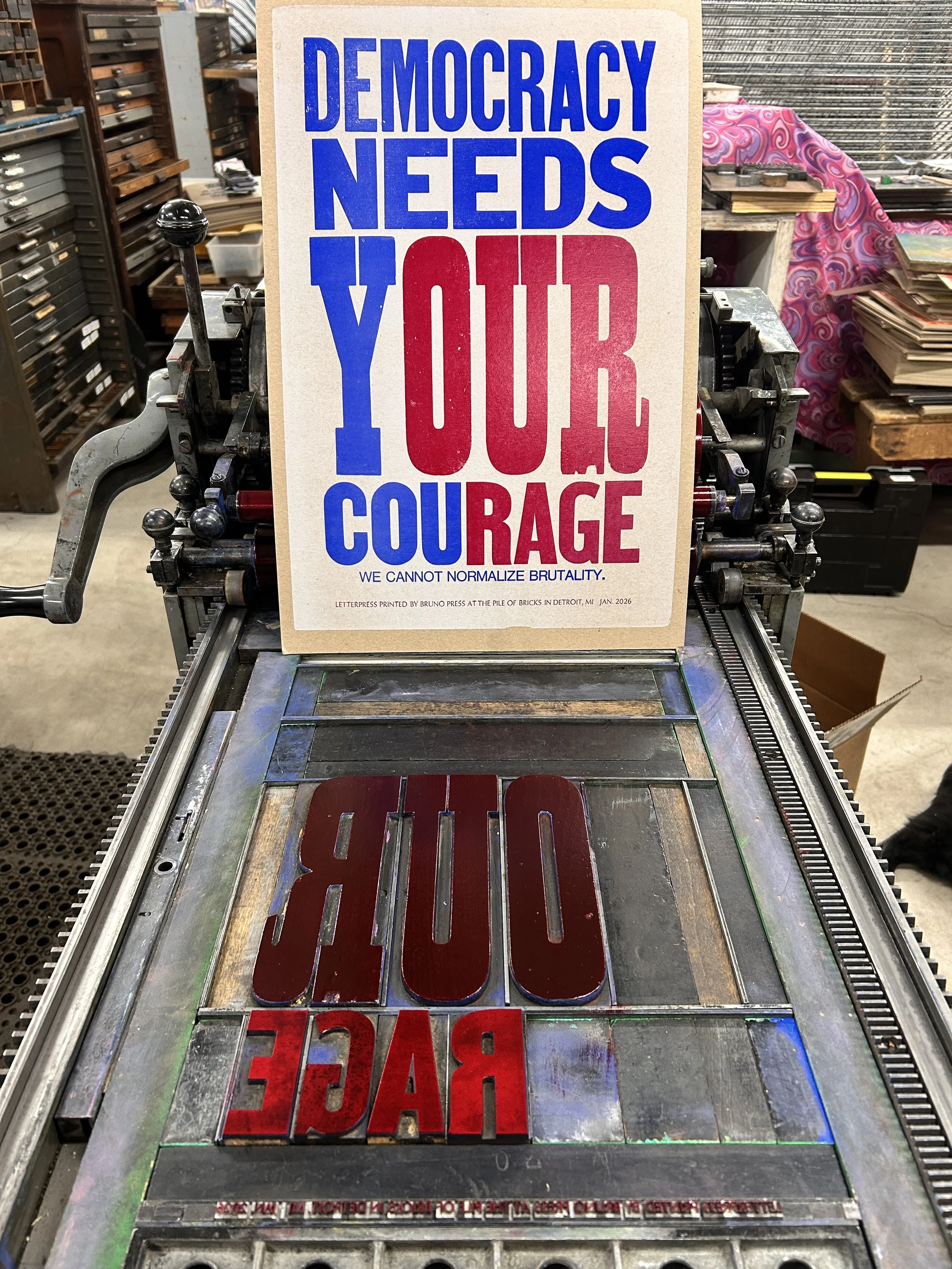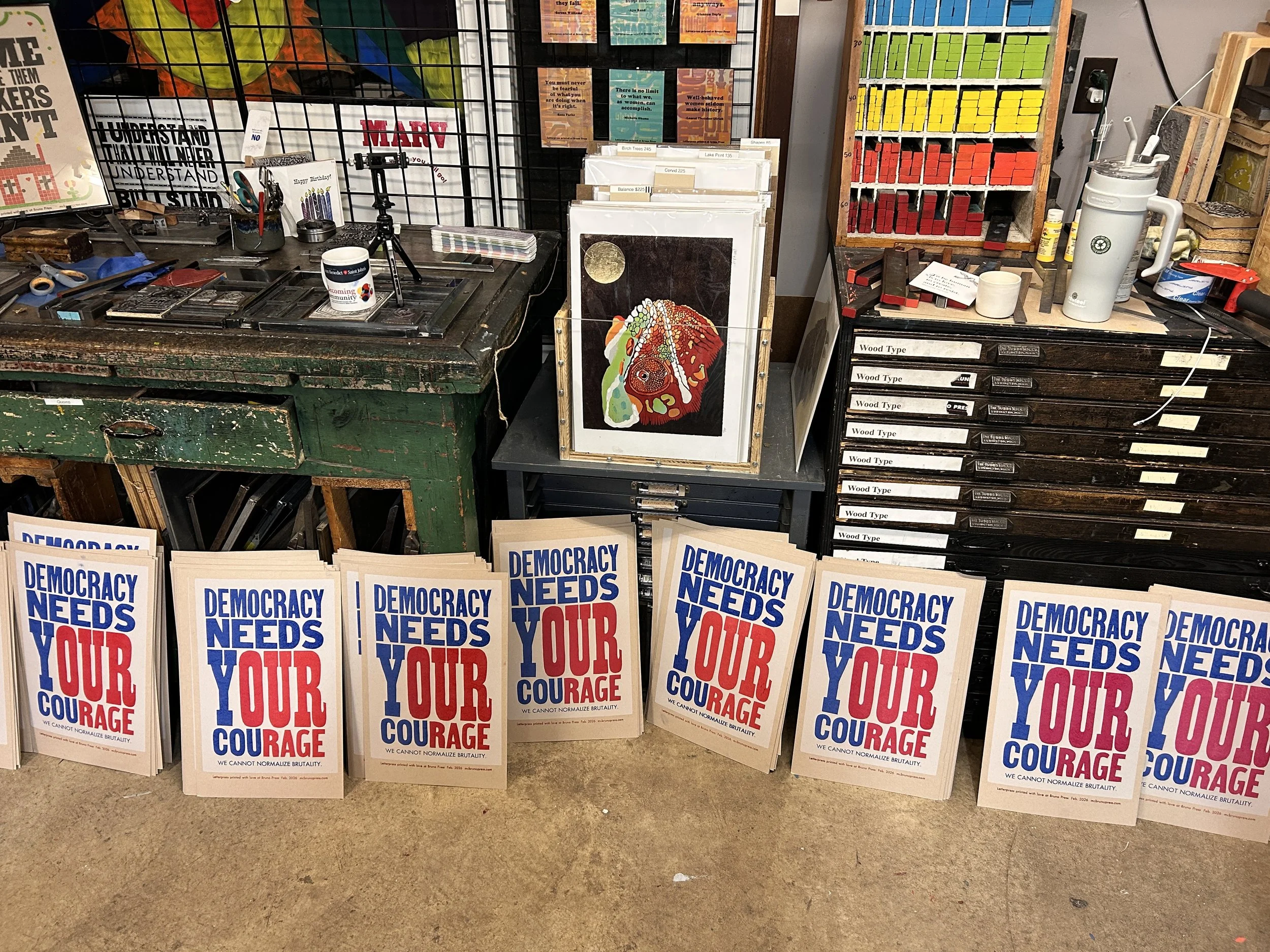 With all the shit going on in Minnesota, the brutality of ICE is always on my mind. I saw a really clever protest poster on the street of St. Joseph and I asked the holder, Lemwa, if I could take her poster idea to the press and she was stoked! The play on words, the HUGE woodtype, and the simplicity of urging folks to stand up for our neighbors and to get mad and get involved. I AM PROUD OF YOU MINNESOTA. Keep fighting the good fight.