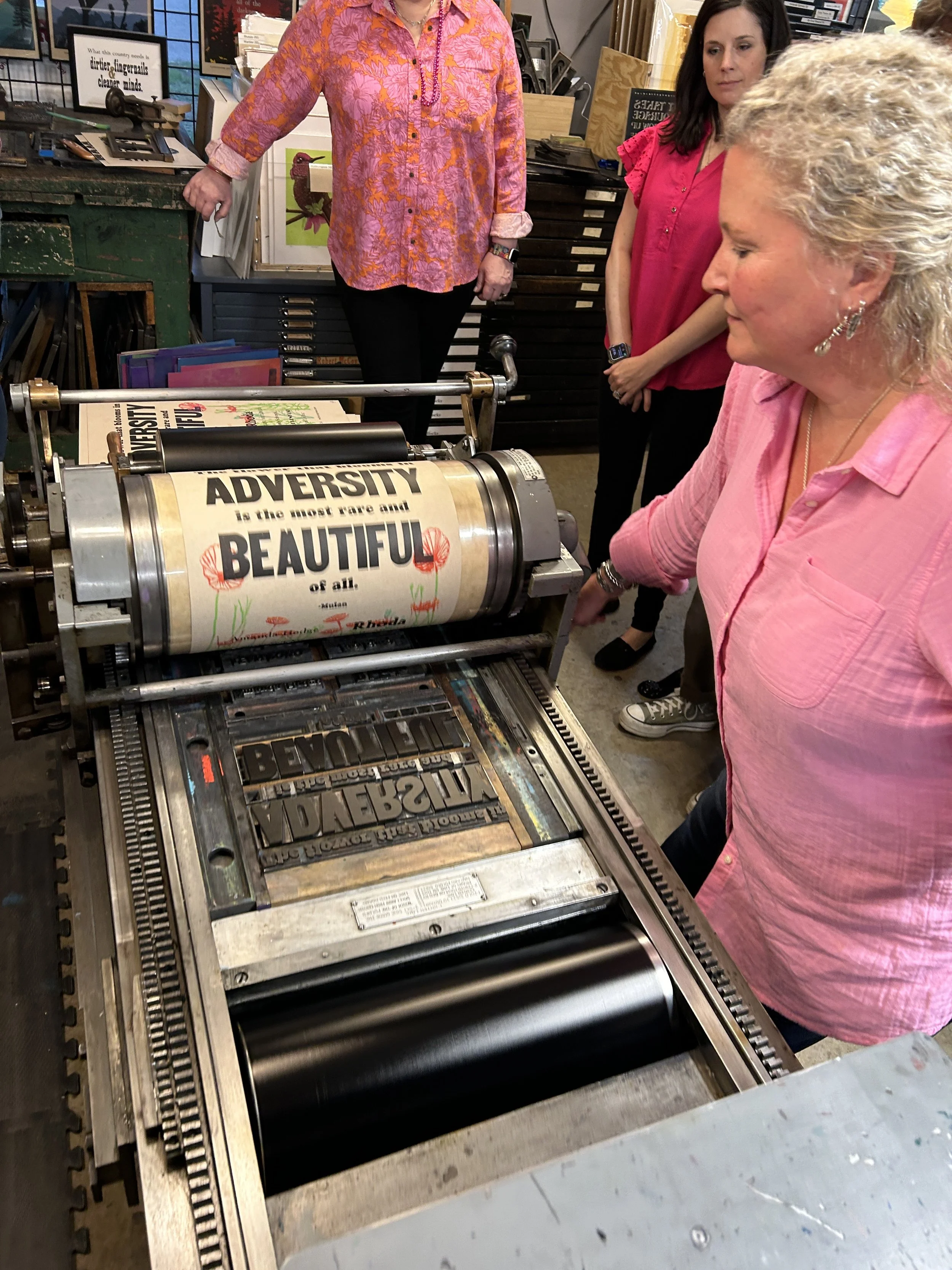 A group of us came together at Bruno Press to surround and encourage a good friend navigating a difficult diagnosis. Mary created amazing space for inspiration and expression, both at the press and for the hours we spent in easy conversation. Our friend chose words for our poster that have become important to all of us, and at the end of the evening each of us had a renewed sense of friendship and support. This was such a memorable way to be together. Something about the creative process freed us to be focused and present with one another in especially deep and important ways. Thank you, Mary! Your Private Print Parties are a rare and beautiful experience!