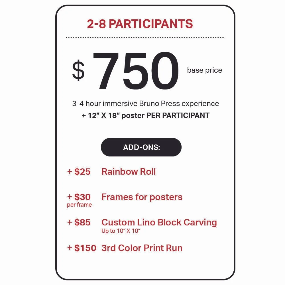 On the day of your party, you’ll experience the magic of the print shop, the legacy of Bruno Press, and the craft of traditional letterpress printing. Groups will get their hands dirty by learning how to set type, inking up the press, and learning how to pull their own prints.
